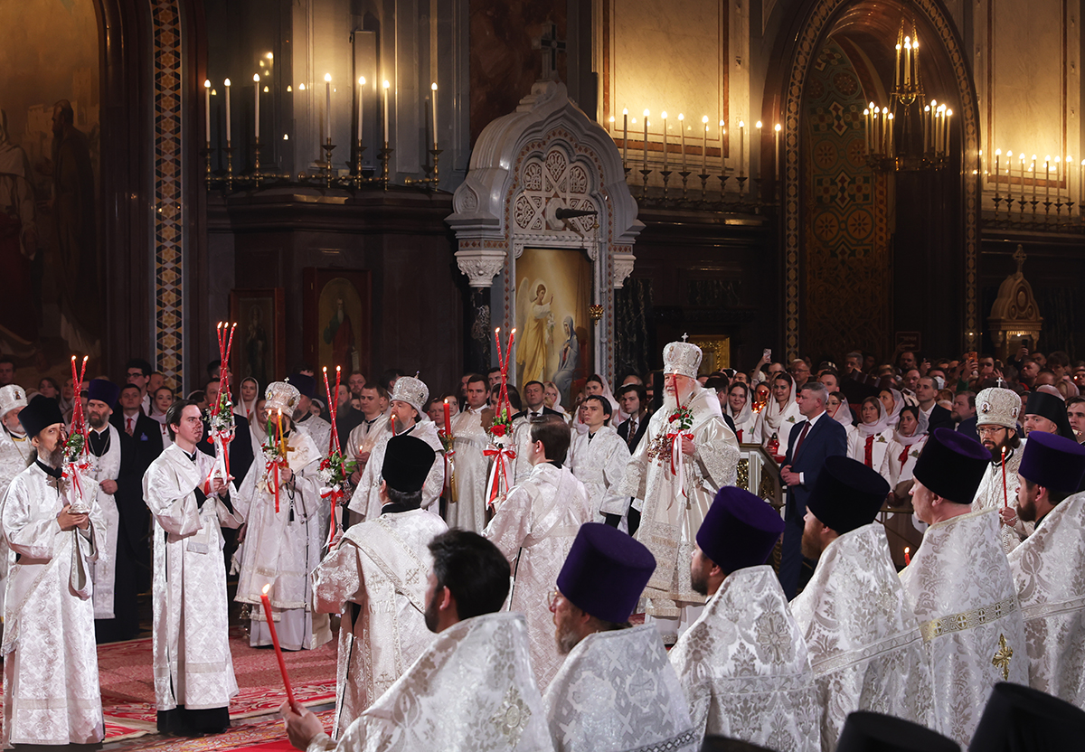 Службу возглавил патриарх Московский и всея Руси Кирилл. Он был облачен в торжественное белое одеяние — саккос и вместе с сонмом духовенства совершал праздничные песнопения. В руках верующих алели красные пасхальные свечи — символ Воскресения. Торжеству предшествовал крестный ход, который изображает путь жен-мироносиц, спешивших к Гробу Спасителя.
