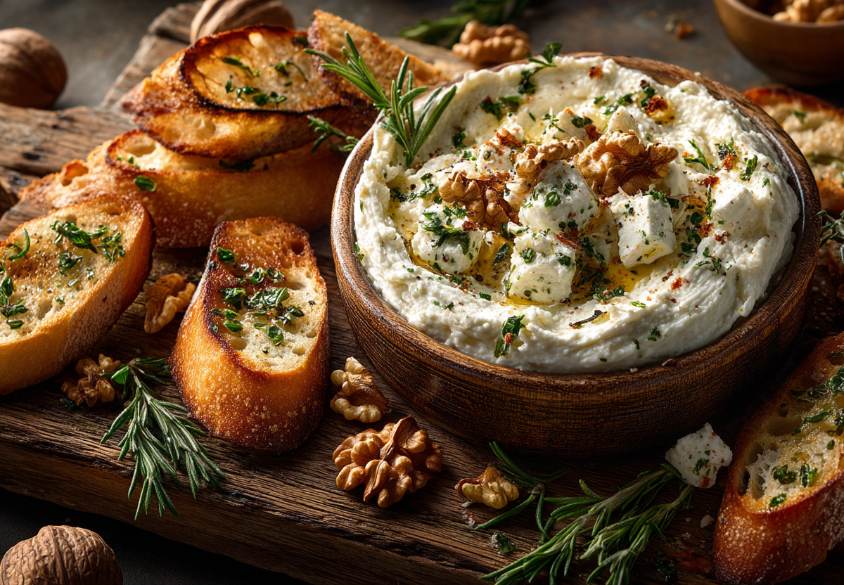 3 головки чеснока, 3–4 ст. л. оливкового масла, 2 веточки розмарина, 3–4 веточки тимьяна, 100 г козьего сыра, 50 г грецких орехов, пучок петрушки, соль, перец, 1/2 багета или чиабатты.