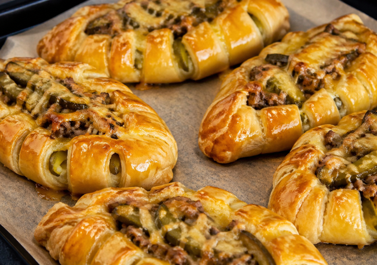 Получается настоящая вкуснятина: золотистые, слоеные лодочки с хрустящими краями и сочной начинкой внутри. Картофель нежный и кремовый, мясо дает насыщенный вкус, а соленые огурчики добавляют ту самую яркую пикантность — оторваться невозможно.