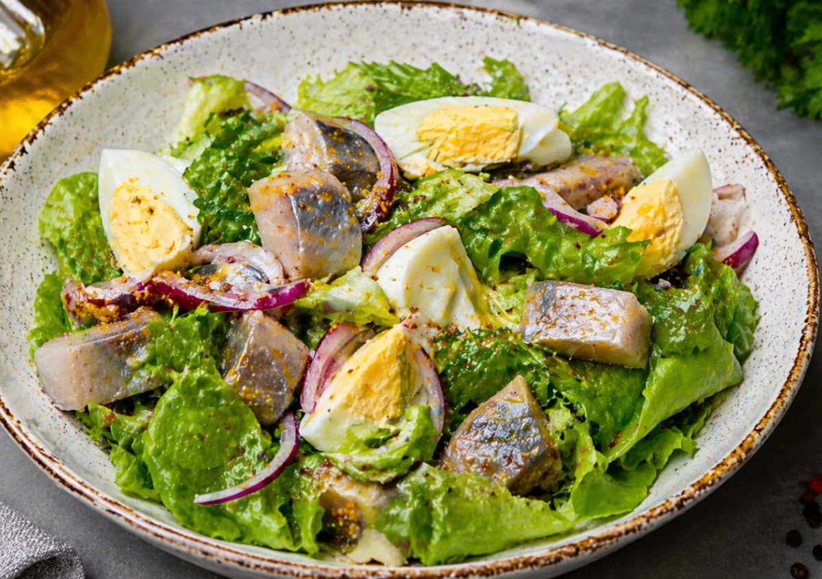 Для заправки смешайте масло, уксус и горчицу до однородности. Соедините в миске селёдку, яйца, лук и салат, аккуратно перемешайте и полейте заправкой непосредственно перед подачей.