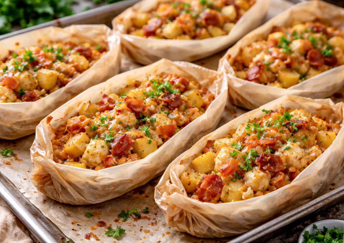 Сформируйте из пергамента небольшие лодочки, разложите в них подготовленную массу и отправьте в разогретую до 190 градусов духовку примерно на 25–35 минут. Готовое блюдо получается румяным, сочным и очень ароматным — перед подачей можно посыпать зеленью.
