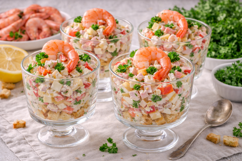 Этот салат оправдывает своё название: выглядит эффектно, получается очень сочным и исчезает со стола одним из первых. Нежные морепродукты, хрустящие сухарики и пикантный соус делают вкус ярким и запоминающимся. Отличный вариант для гостей и особых случаев.