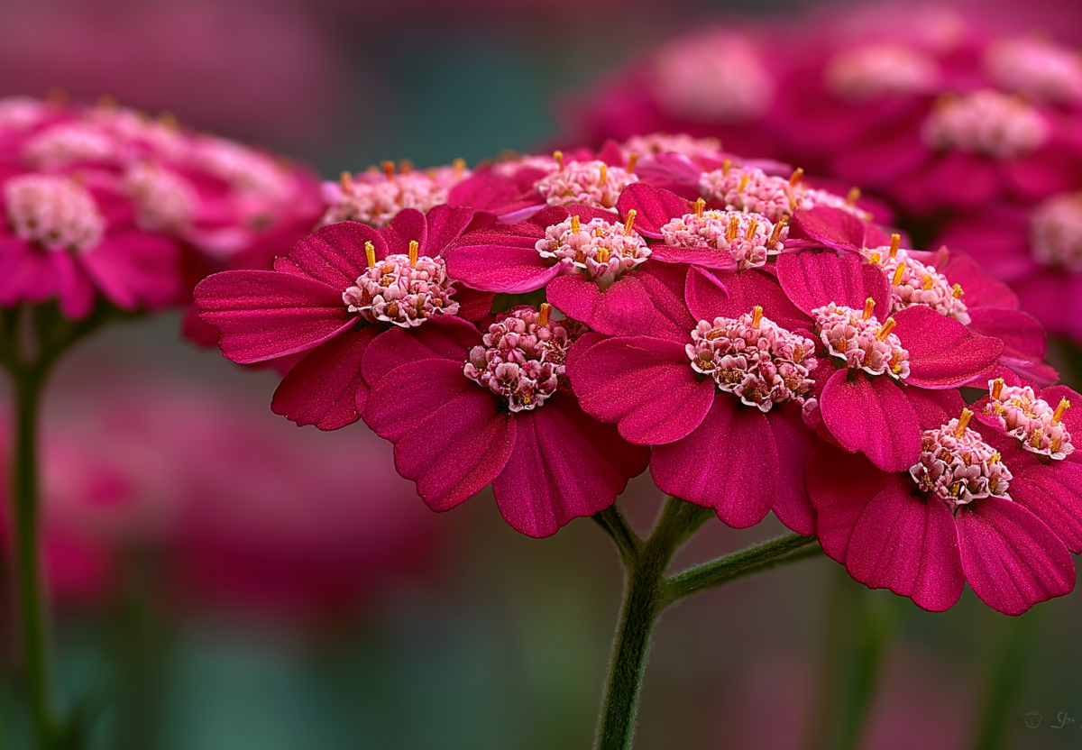 Тысячелистник «вишневая королева» — это многолетник, который привлекает внимание яркими, насыщенными щитками с розово-вишневыми цветками, собранными в плотные шапки.