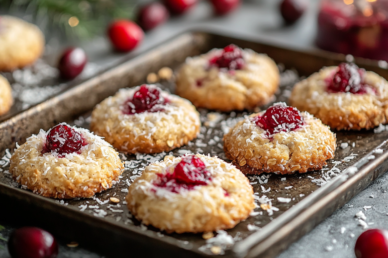 В творожную массу добавляю 100 г овсяных хлопьев — чем больше хлопьев, тем плотнее будет тесто. Формирую печенье: беру порцию теста, внутрь кладу несколько ягод клюквы, скатываю в шарик и обваливаю в кокосовой стружке. Выкладываю на противень с пергаментом и выпекаю при 180–200 °C до золотистого цвета.