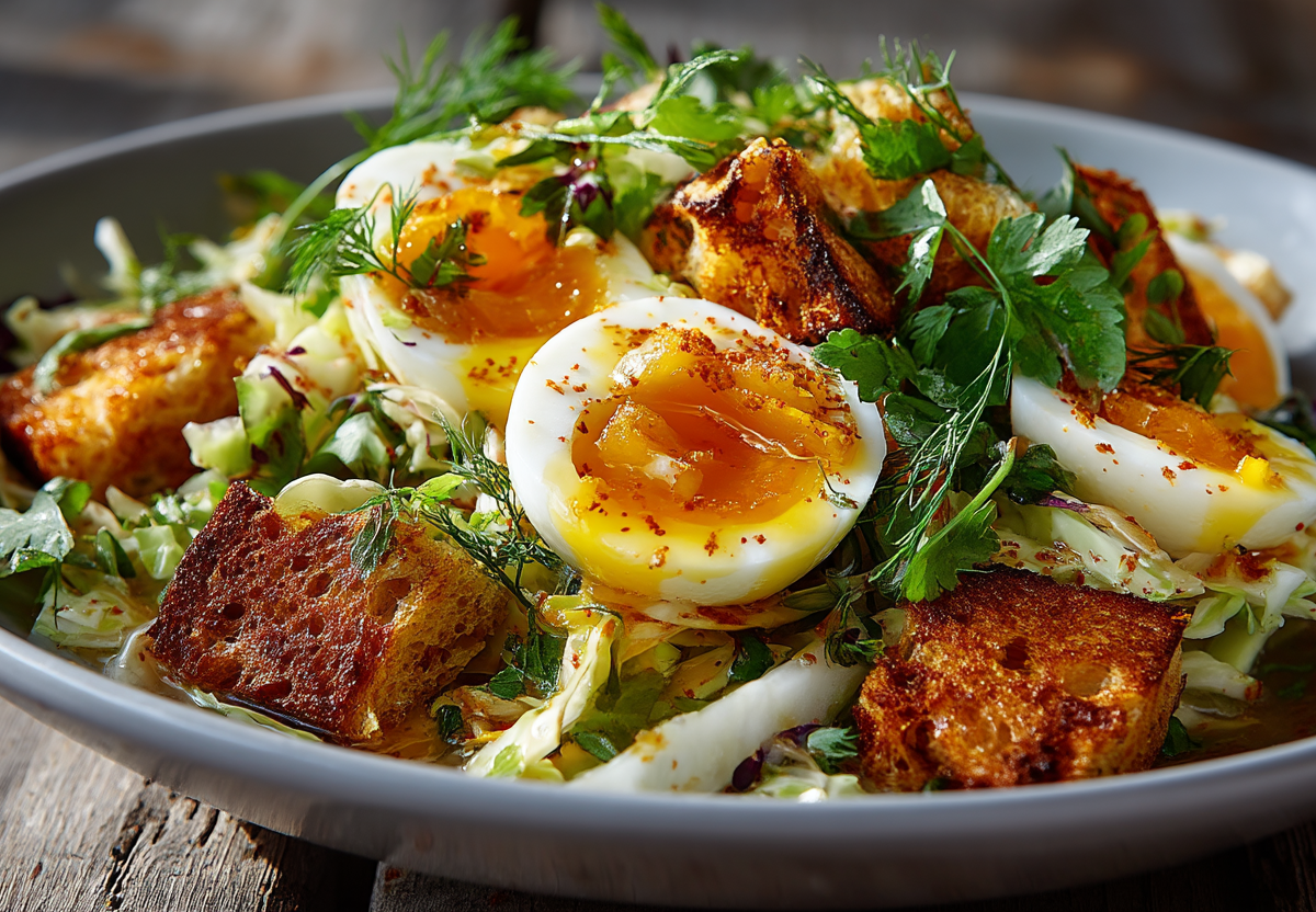 Всегда считал, что салат из капусты — это что-то простое и скучное. Пока не попробовал добавить туда яйца всмятку с кремовым желтком. Это полностью меняет игру.