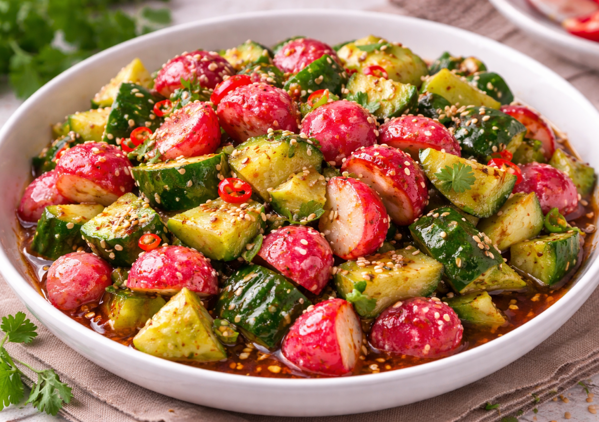 Как только появляются свежие овощи, сразу хочется чего-то легкого, хрустящего и с ярким вкусом. Битая редиска с огурцами — как раз тот вариант: просто, быстро и очень сочно. А сладкий соус чили дает ту самую пикантно-сладкую нотку, из-за которой невозможно остановиться. Получается свежо, ароматно и очень «в тему» весеннего стола.
