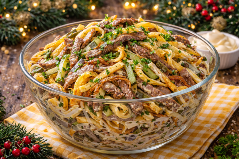 Есть салаты, которые не нуждаются в представлении, но почему-то реже появляются на праздничном столе. «Министерский» — именно такой. Сытный, элегантный и очень «взрослый» по вкусу, он спокойно стоит в одном ряду с оливье, мимозой и шубой. Главная фишка этого салата — яичные блинчики вместо вареных яиц и нарезка всех ингредиентов тонкой соломкой. А еще я всегда делаю его с обжаренным луком.