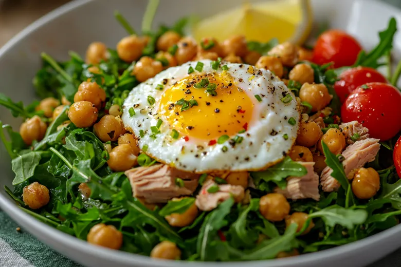 Для приготовления вам понадобится: 1 банка тунца в собственном соку (около 150 г), 1 яйцо, 200 г отварного или консервированного нута, 100 г руколы или смеси салатов, 1 зубчик чеснока. Для заправки: 3 ст. л. оливкового масла, сок половины лимона, 1 ч. л. дижонской горчицы, соль, перец. Нут обсушите и обжарьте на разогретой сковороде с 1 ст. л. масла до золотистого хруста, в конце добавьте давленый чеснок. Тунец разомните вилкой. Для яйца пашот влейте в кастрюлю воду, добавьте 1 ст. л. уксуса, создайте воронку и аккуратно влейте яйцо, варите 2–3 минуты. Для заправки смешайте масло, лимонный сок, горчицу, соль и перец. На тарелку выложите руколу, сверху — тунец и тёплый нут. Украсьте яйцом пашот, полейте заправкой и сразу подавайте.