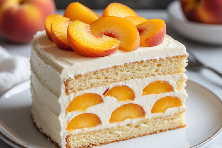 Получается обалденная вкуснятина: нежные, пропитанные миндальным ликером бисквитные коржи, прослоенные воздушным сливочно-сырным кремом с кусочками сочных персиков, которые дают идеальный баланс сладости и легкой фруктовой кислинки.