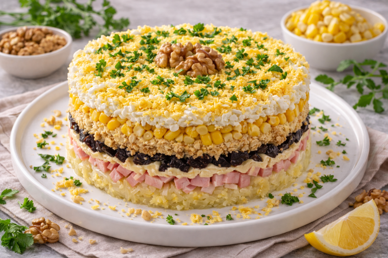 Салат «Гусарский» — это удачное сочетание простых ингредиентов с насыщенным, запоминающимся вкусом. Картофель и яйца делают его сытным, ветчина добавляет пикантности, а чернослив с орехами — благородную сладкую нотку. Такой салат отлично смотрится на праздничном столе и всегда собирает комплименты.