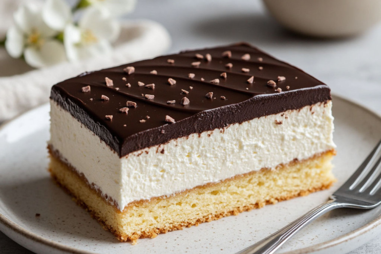 Получается потрясающая вкуснятина: тонкий, мягкий ванильный корж, покрытый толстым слоем невесомого, тающего суфле, и хрустящая темная шоколадная глазурь сверху.