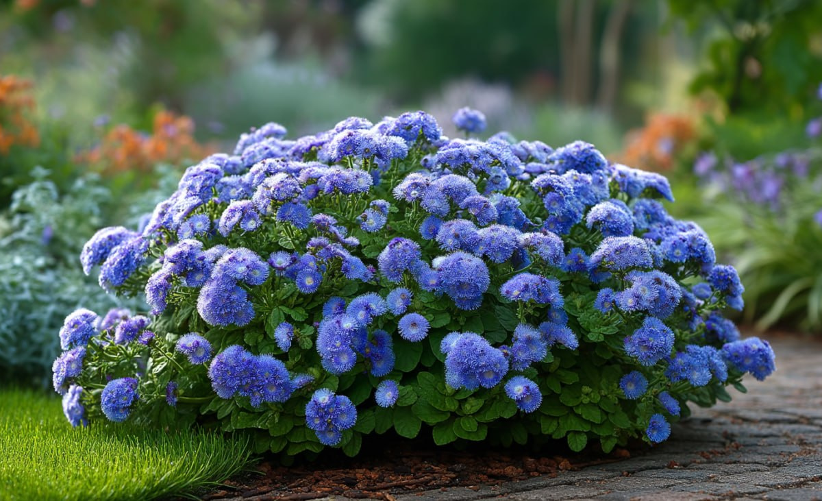 Агератум невероятно универсален: низкорослые сорта (15–30 см) идеальны для бордюров и ковровых клумб, а более высокие (до 60–70 см) прекрасно смотрятся в миксбордерах и на срезку.
