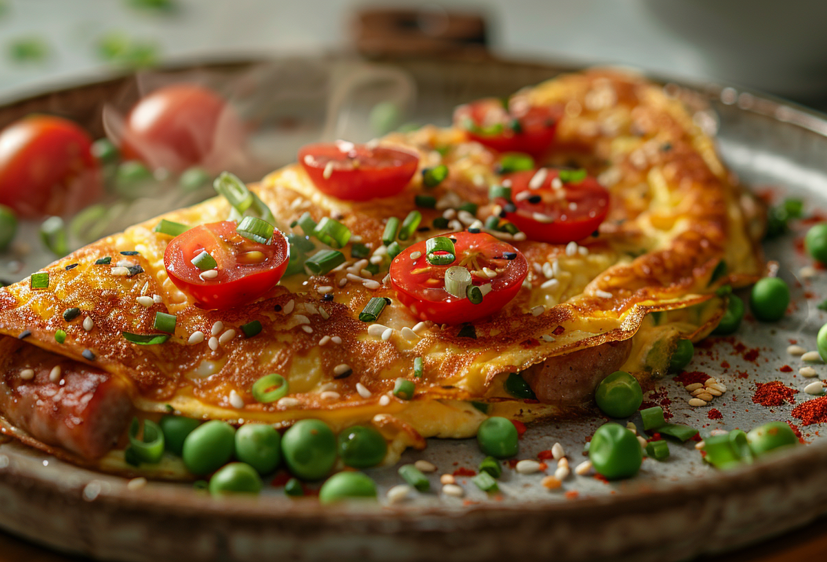 Иногда обычный омлет можно превратить в настоящее утреннее удовольствие всего несколькими простыми добавками. Горсть зеленого горошка, сочные черри и немного сыра делают блюдо ярким, сытным и очень ароматным. Такой завтрак готовится быстро, выглядит аппетитно и надолго избавляет от чувства голода.