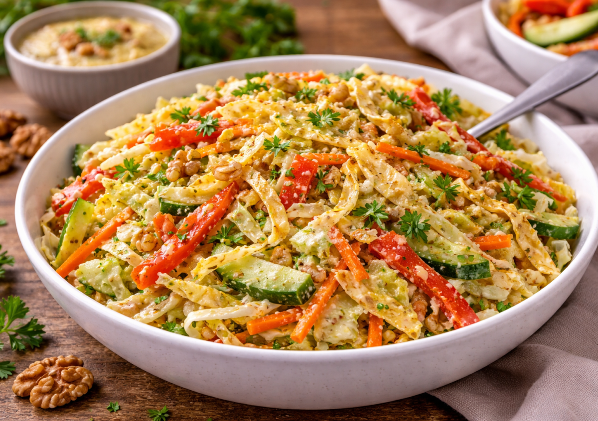 Суперлегкий салат с ореховой заправкой — свежий, хрустящий и сытный без лишней тяжести. Сочетание овощей, яичных блинчиков и ароматной заправки дает тот самый вкус, когда вроде просто, а оторваться невозможно.