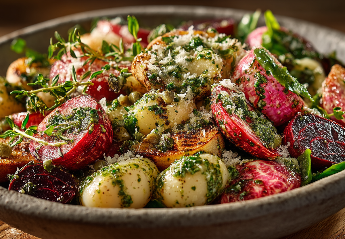 Запеченный редис — малоизвестный, но гениальный прием. Всего 15 минут в духовке — и его пикантная острота смягчается, уступая место карамельным нотам, которые идеально сочетаются с фасолью и пикантной заправкой.