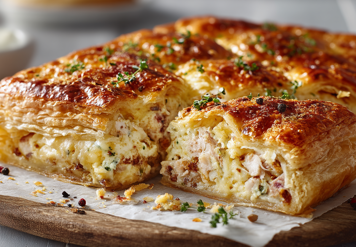 Сделайте сверху несколько небольших надрезов для выхода пара. Смажьте пирог взбитым яйцом для румяной корочки. Выпекайте в разогретой до 200°C духовке 25 минут до золотистого цвета.