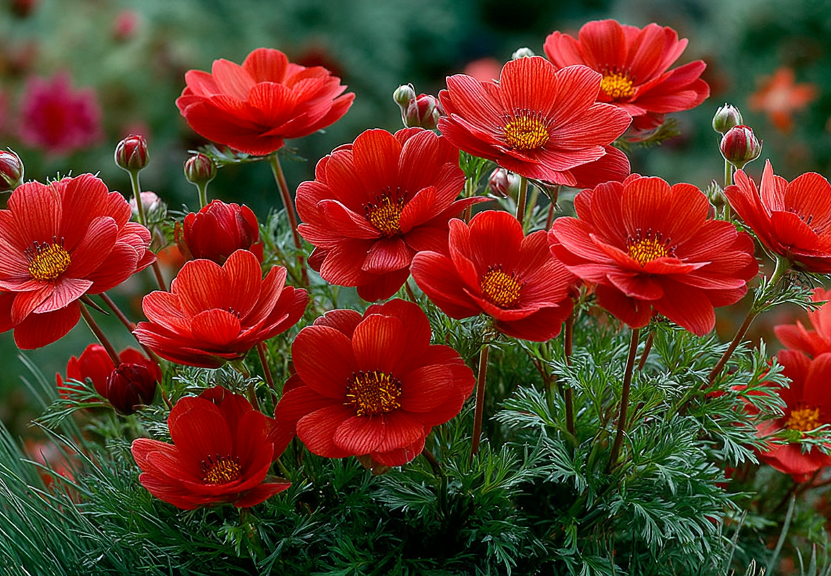 Если же вы хотите создать яркий бордюр вдоль дорожки, обратите внимание на адонис летний кроваво-красный — невысокий однолетник (до 30 см) с ажурной листвой и огненными цветками, который размножается самосевом и не требует рассады.
