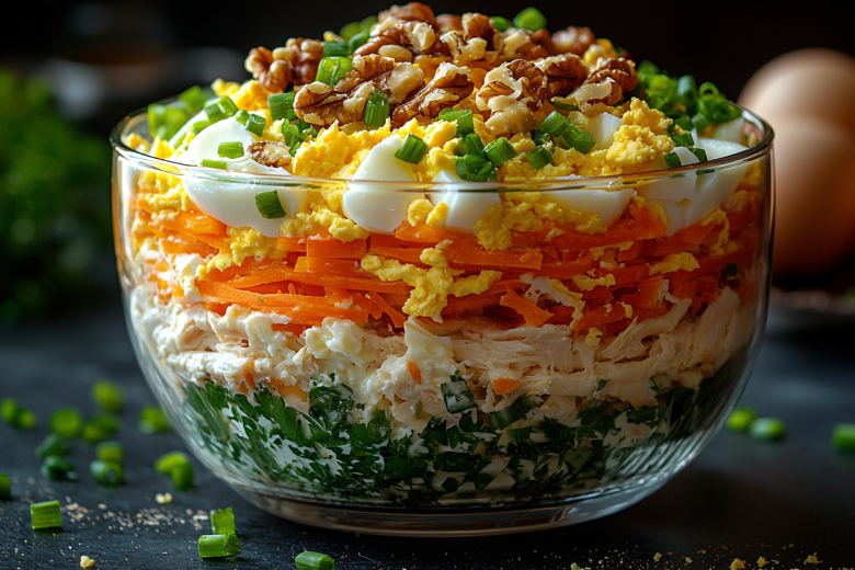Каждый слой этого салата выстроен логично: снизу — плотная основа из курицы с чесноком, затем нежный сыр, сладковатая морковь, и наконец — воздушная шубка из яиц и орехов. Майонез здесь не просто заправка, а тонкий скрепляющий элемент.