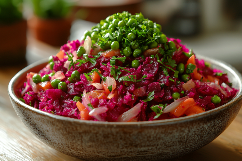 Для приготовления понадобится: 3 средние свеклы, 2 моркови, крупная луковица, банка консервированного зеленого горошка, соль по вкусу. Свеклу тщательно вымойте, отварите в кожуре до мягкости или запеките в фольге в духовке. Остудите, очистите и натрите на крупной терке. Морковь очистите и натрите на той же терке. Лук нарежьте мелкими кубиками. На сковороде разогрейте масло, обжарьте лук до прозрачности и легкой золотистости, затем добавьте морковь и жарьте вместе еще 5–7 минут на среднем огне, помешивая, до мягкости моркови. Дайте овощной зажарке полностью остыть. В большой салатнице соедините натертую свеклу, остывшую зажарку из лука и моркови. Добавьте зеленый горошек, предварительно слив с него жидкость. Тщательно перемешайте, посолите по вкусу. При желании можно добавить щепотку черного перца.