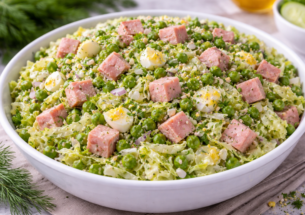 Ингредиенты: пекинская капуста — половина кочана, яйца — 3 шт., фиолетовый лук — 1 шт., зеленый горошек — половина банки, ветчина — 150–200 г, зелень (укроп, петрушка) — по вкусу, соль, перец.