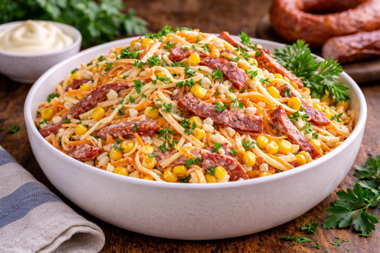 Этот салат — настоящая палочка-выручалочка, когда нужно быстро приготовить что-то вкусное и эффектное. Копченый сыр-косичка дает яркий аромат, колбаса добавляет сытности, а свежая морковь — сочность и хруст. Минимум времени, никаких сложных шагов — и на столе уже готовый хит.