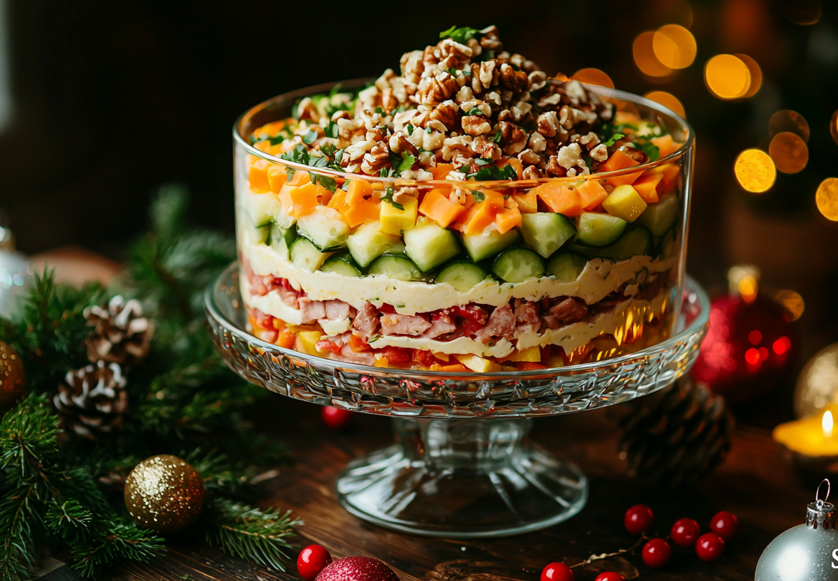 Картофель отвариваю в мундире, очищаю и натираю на крупной терке. Огурцы и колбасу нарезаю мелким кубиком, лук шинкую как можно мельче. Сыр тру на терке — он будет встречаться в нескольких слоях. Морковь натираю на мелкой терке для сочности, яйца измельчаю. Собираю слоями: сначала хрустящие огурцы, затем картофельная подушка с майонезной сеточкой, душистый лук, сырный слой, яркая морковь, снова сыр, нежная колбаса, яичная крошка и завершаю сыром с чесночным майонезом.