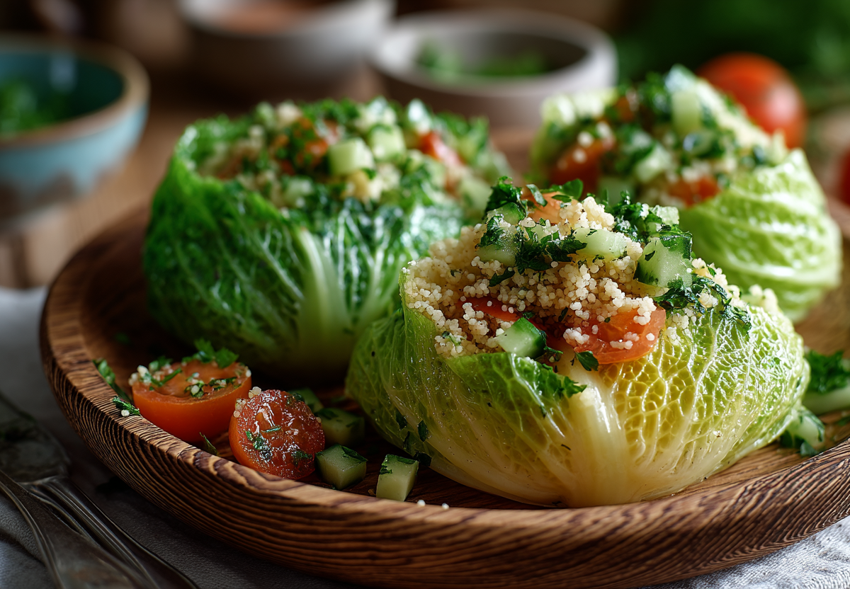Рецепт: отварите кускус согласно инструкции на упаковке (обычно залить кипятком на 5–10 минут). Остудите. Зелень, огурец и помидор нарежьте очень мелко. В большой миске смешайте кускус, зелень и овощи. Добавьте лимонный сок, оливковое масло и соль. Тщательно перемешайте. Пекинскую капусту разберите на отдельные листья. Выложите готовый салат на листья капусты.