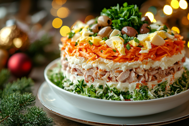 Ингредиенты: копченый куриный окорочок (1 шт.), морковь по-корейски (180 г), салат айсберг или пекинская капуста (150 г), яйца (4 шт.), твердый сыр (150 г), зеленый лук, маслины без косточек, майонез.