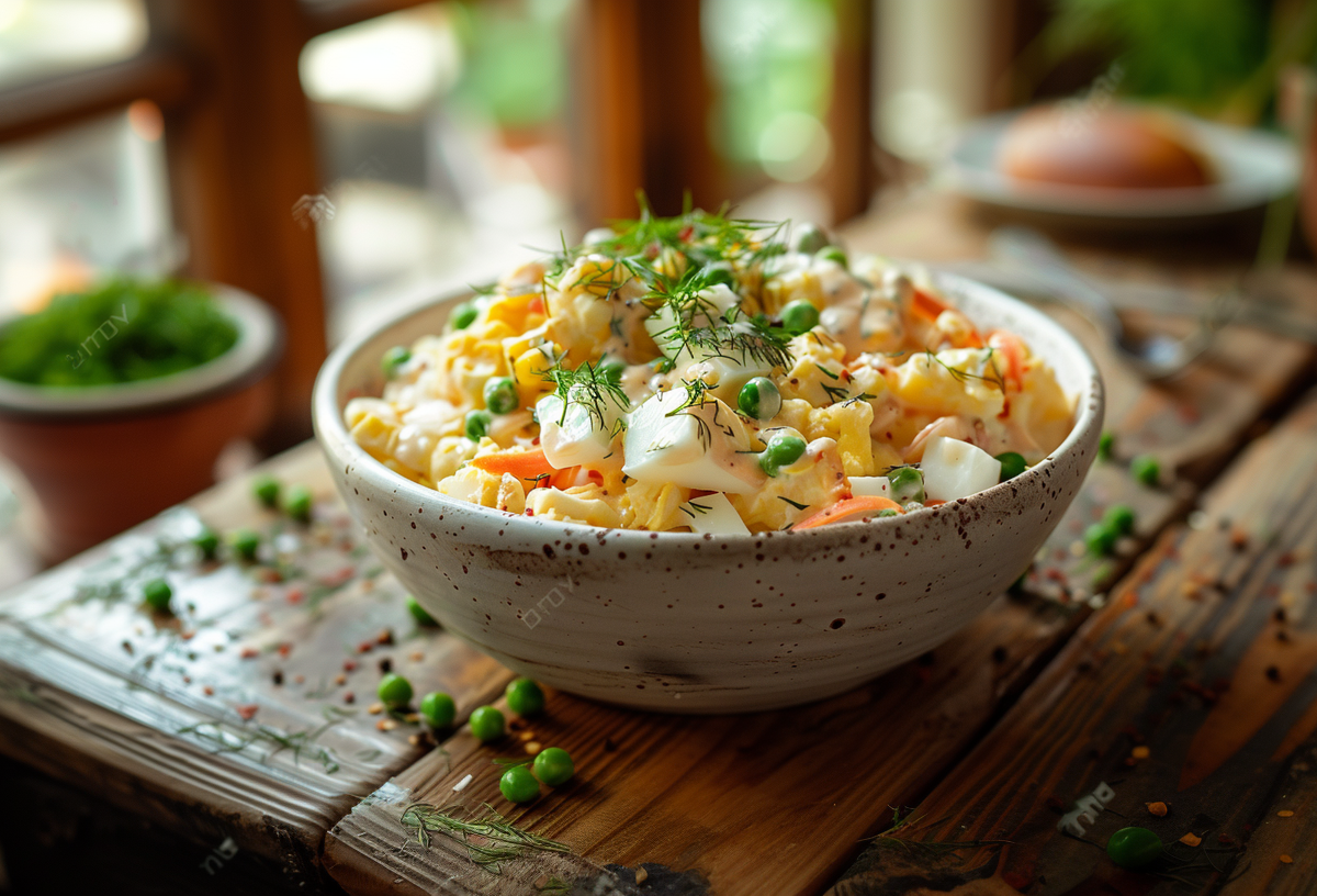 Отдельно приготовьте заправку: смешайте майонез или сметану с измельченным чесноком, горчицей, соевым соусом и укропом. Соедините все ингредиенты в миске, добавьте соус и тщательно перемешайте.