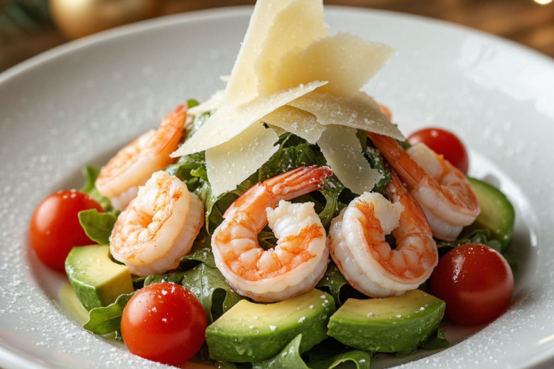 Этот салат — воплощение новогодней элегантности. В нем сочетаются нежные креветки, бархатистое авокадо и сочные томаты черри, а легкая заправка на основе цитруса и оливкового масла подчеркивает свежесть каждого ингредиента. Финальный штрих — воздушная стружка выдержанного пармезана, которая, подобно первому инею, покрывает салат, добавляя пикантную солоноватую ноту и завершая этот изысканный вкусовой ансамбль.