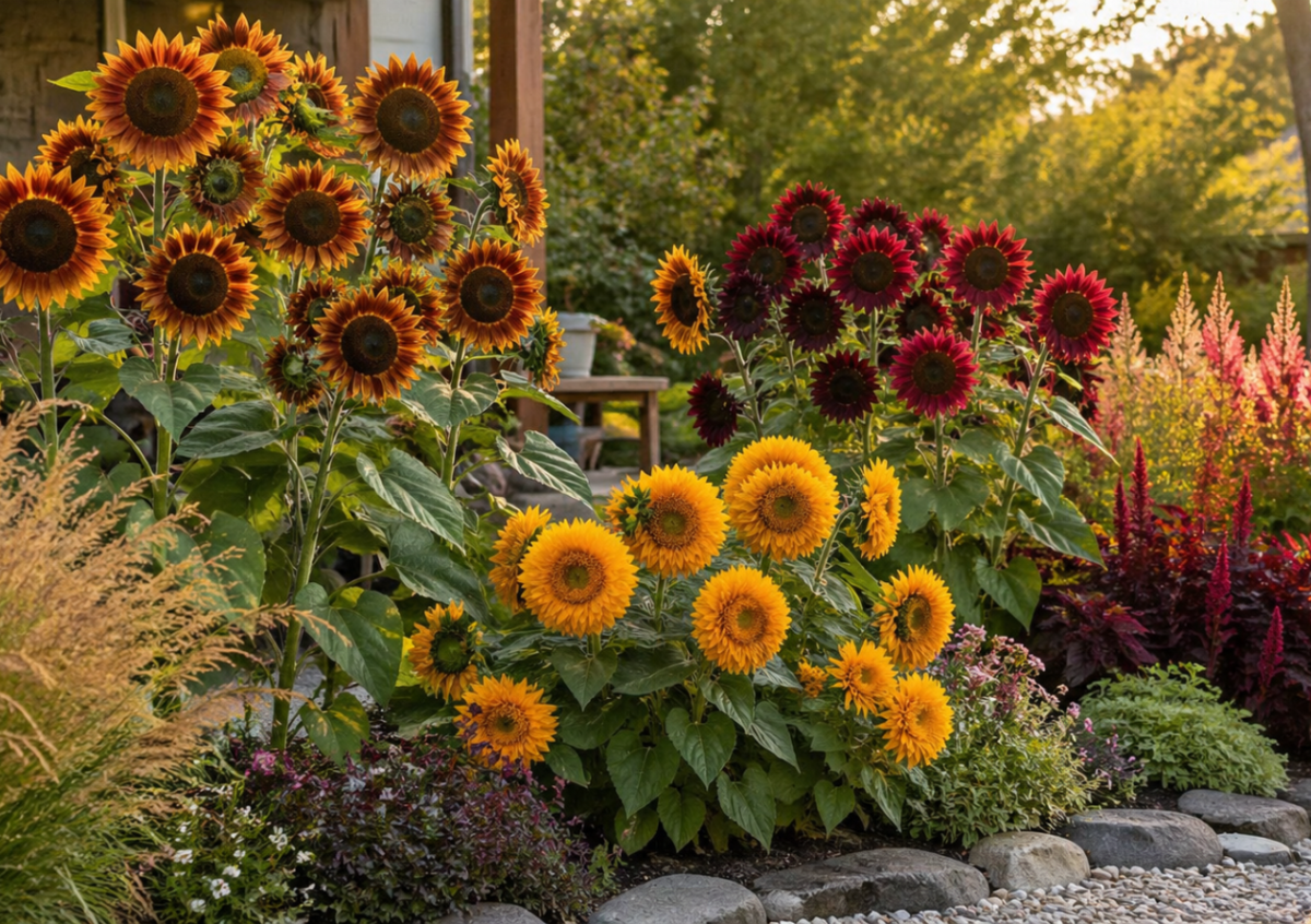Этот необычный сорт часто вводит в заблуждение: издалека его принимают за крупные ромашки, но при ближайшем рассмотрении становится ясно — перед вами эффектный декоративный подсолнечник. Он моментально привлекает внимание благодаря редкому бронзово-красному оттенку лепестков и внушительным соцветиям до 15 см в диаметре.