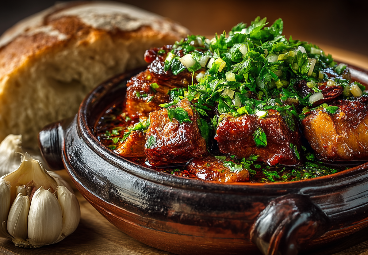 Каурма — блюдо со сложной судьбой и множеством интерпретаций от Балкан до Кавказа. Но именно грузинский вариант с томленой свининой и яркой пастой из чеснока и уцхо-сунели стал для меня эталоном вкуса.