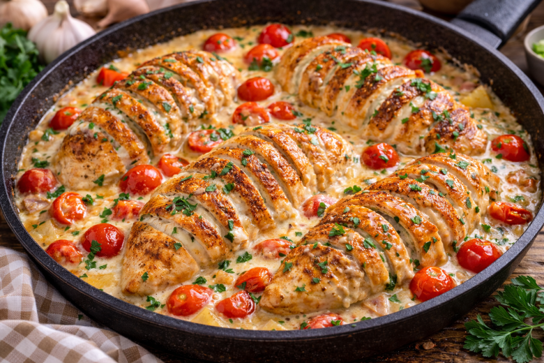 Обычное куриное филе легко превратить в изысканное блюдо. Нежное мясо, сливочный соус и сочные томаты создают идеальное сочетание. Готовится просто, а вкус — как в хорошем ресторане. Отличный вариант для ужина, когда хочется порадовать себя и близких без лишней суеты.
