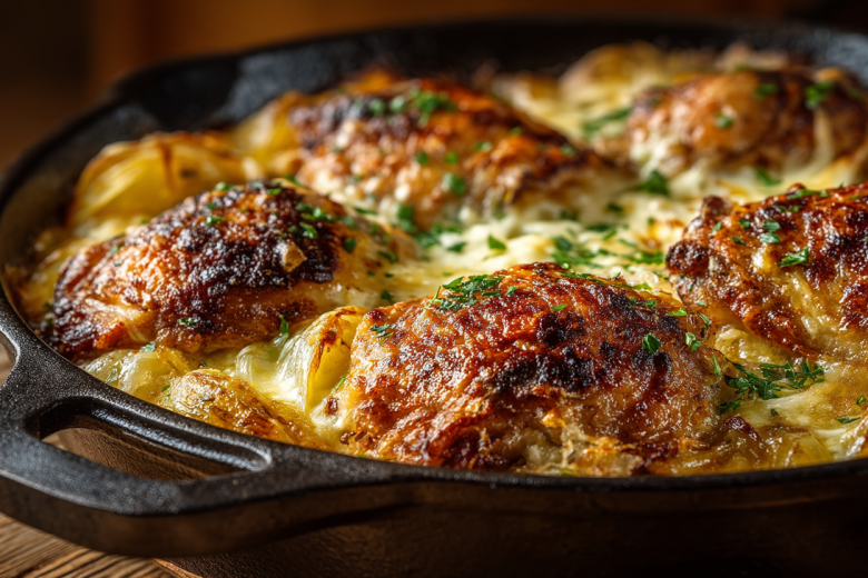 Для блюда беру 6-8 куриных бедер (можно с кожей). Для маринада смешиваю в миске 2 столовые ложки соевого соуса, 2 столовые ложки сметаны или майонеза, 2 зубчика чеснока (пропущенных через пресс), соль, черный перец и 1 чайную ложку сушеных прованских трав. Заливаю этим маринадом курицу, хорошо перемешиваю и оставляю минимум на 30 минут (можно на несколько часов в холодильнике). Духовку разогреваю до 200°C. 6-8 средних картофелин очищаю и нарезаю тонкими дольками (как на жареную картошку). Две крупные луковицы очищаю и нарезаю тонкими полукольцами. Противень с высокими бортиками слегка смазываю растительным маслом. Выкладываю картофель ровным слоем, солю и перчу по вкусу. Затем равномерно распределяю по картошке лук. Сверху выкладываю маринованные куриные бедра вместе со всем оставшимся маринадом. Плотно накрываю противень фольгой и отправляю в духовку на 30 минут. Затем снимаю фольгу, обильно посыпаю все содержимое противня 150-200 граммами тертого сыра (чеддер, гауда или российский) и запекаю еще 15-20 минут без фольги, пока курица не зарумянится, а сыр не расплавится и не подрумянится. Подаю сразу, прямо из духовки, посыпав свежей рубленой зеленью.