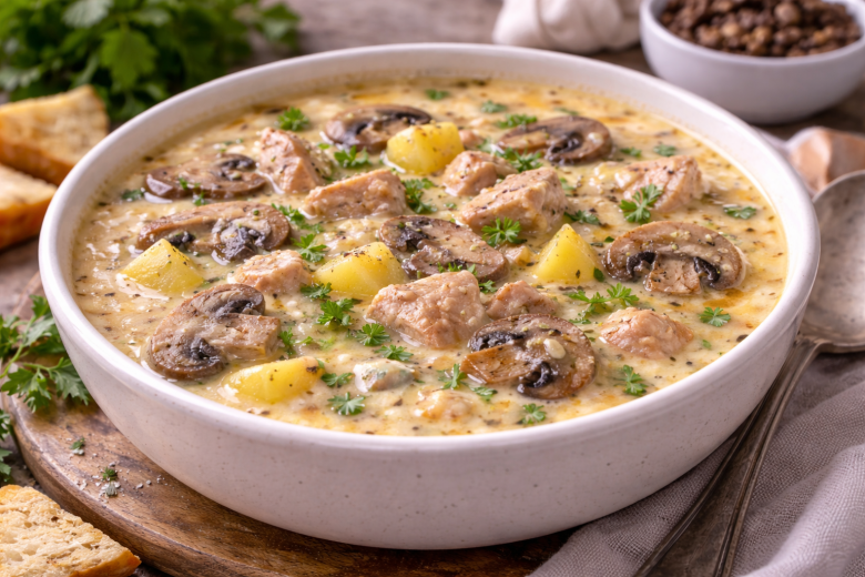 Сырный суп с курицей и шампиньонами — настоящая палочка-выручалочка, когда хочется чего-то теплого, сливочного и по-домашнему уютного. Минимум ингредиентов, никакой сложности, а результат — нежный, ароматный суп, который нравится даже тем, кто к грибам обычно равнодушен. Готовится быстро, съедается еще быстрее.