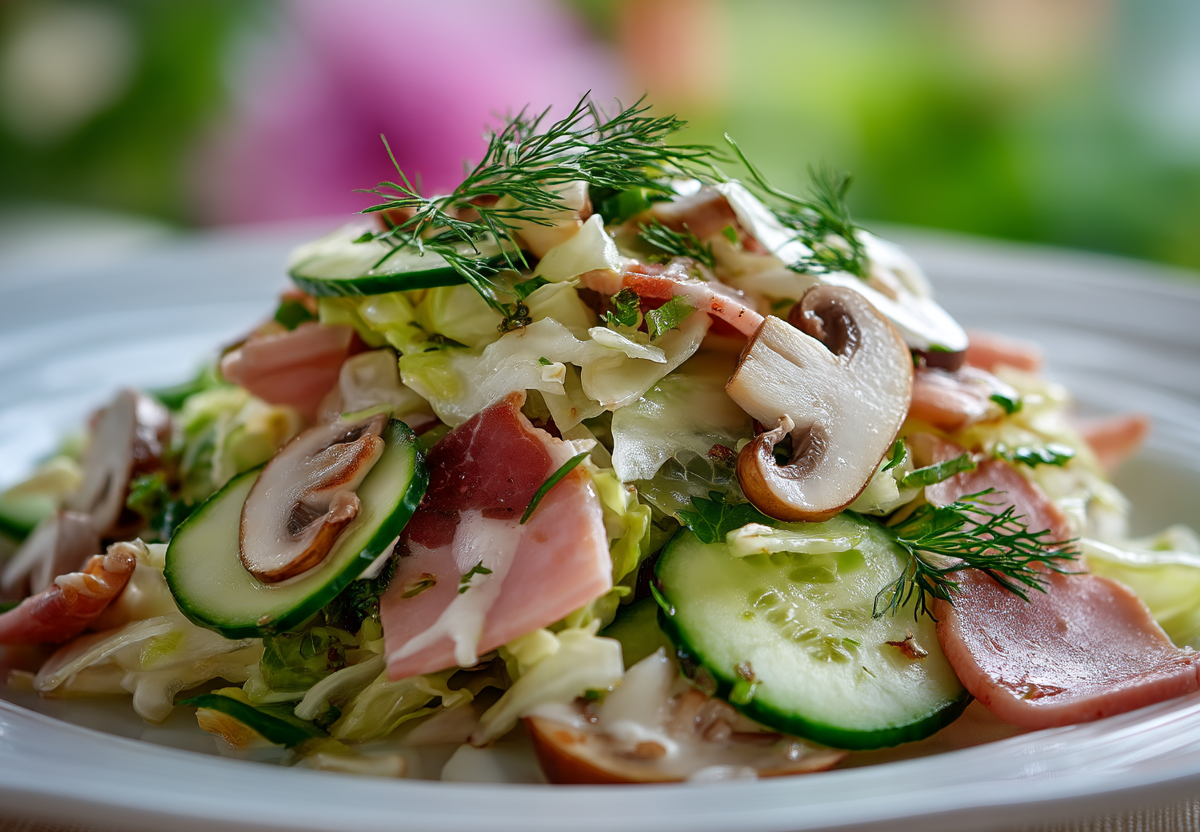Для приготовления вам понадобится: кочан пекинской капусты, 200 г шампиньонов, 150 г сыра сулугуни, 2 свежих огурца, 200 г ветчины, майонез и соль по вкусу. Капусту мелко нашинкуйте, огурцы и ветчину нарежьте тонкой соломкой. Шампиньоны нарежьте слайсами и обжарьте на масле до готовности. Сыр натрите на крупной терке. Смешайте все ингредиенты в глубокой миске, заправьте майонезом, посолите по вкусу. Дайте настояться 15 минут — и можно подавать. Этот салат впечатляет сочетанием ингредиентов, и вам точно захочется добавки.