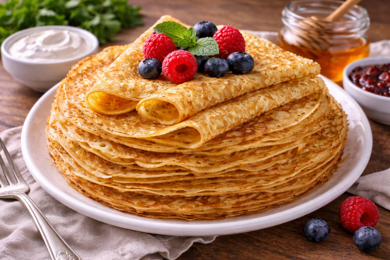 Эти блинчики — как из детства: тонкие, нежные, с кружевными краями и ароматом уюта. Стоит поставить сковороду на плиту, и дом сразу наполняется праздничным настроением. Они мягкие, не рвутся, отлично сворачиваются и подходят и к варенью, и к меду, и к сметане — проверенный вариант на каждый год.