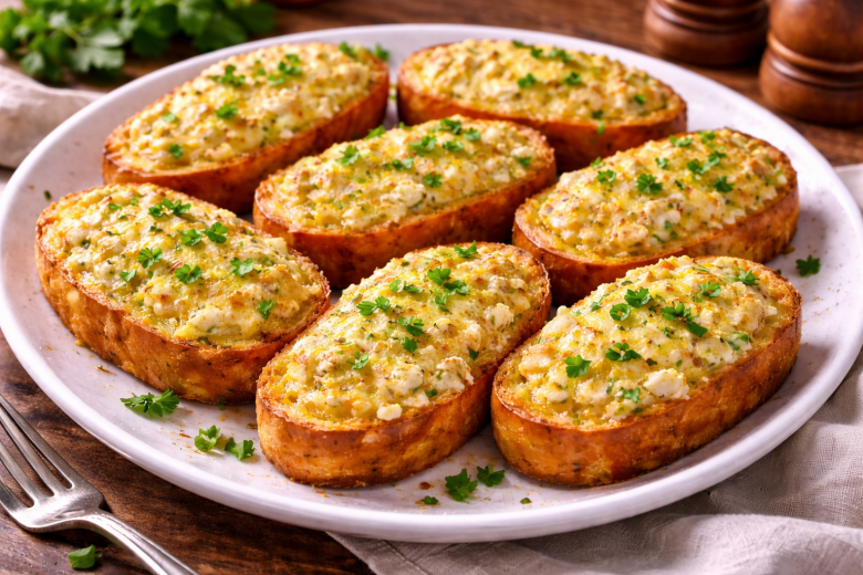 Приготовление: яйца взбейте с молоком, солью, перцем и травами. Ломтики хлеба обмакните в яичную смесь и выложите на противень с пергаментом. Творог смешайте с тертым сыром до однородности и распределите начинку поверх хлеба. Отправьте в разогретую до 180 °C духовку и запекайте 15–20 минут до золотистой корочки. Подавайте горячими — с ароматом сыра и хрустящей корочкой.