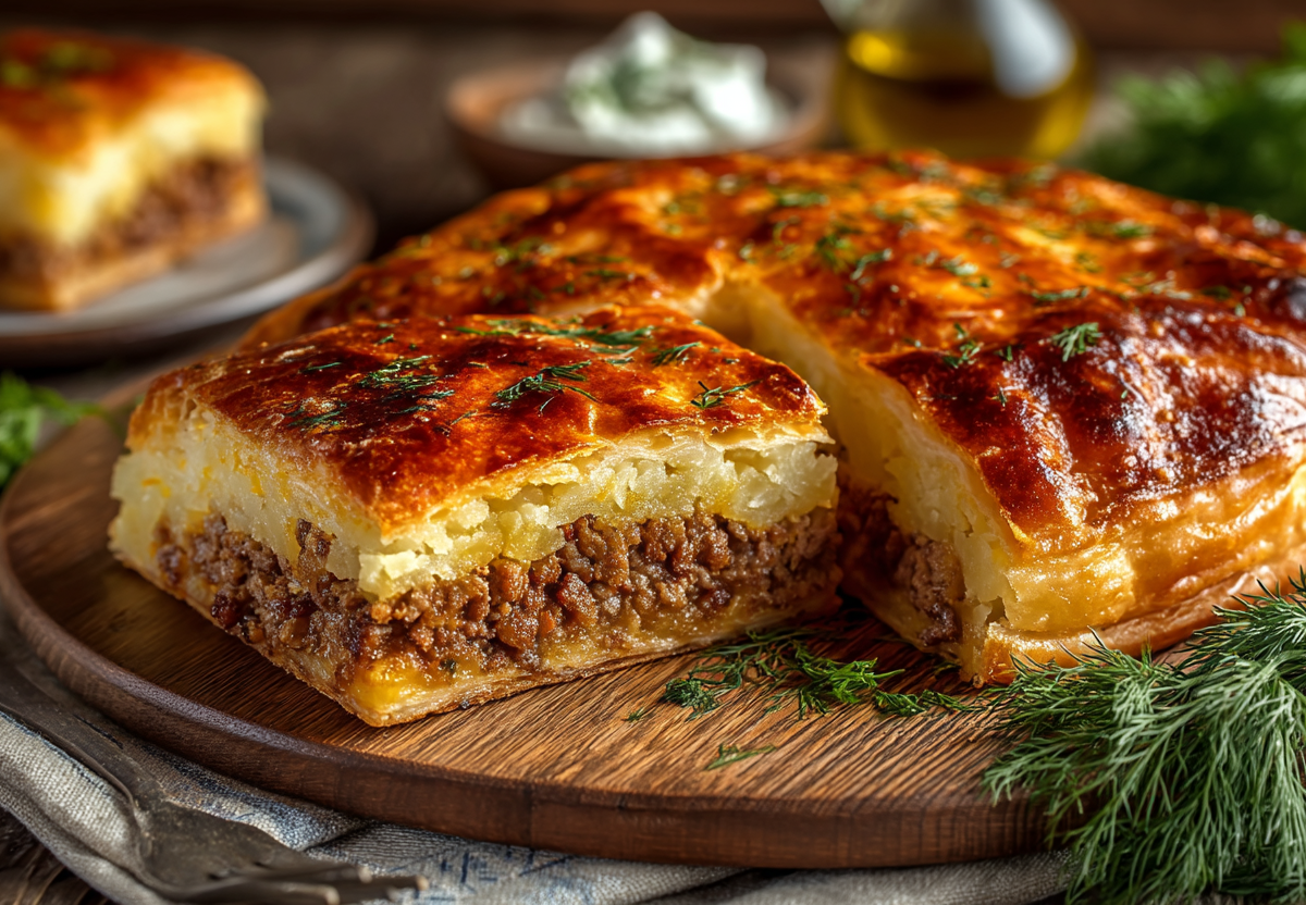 Нежное, рассыпчатое тесто без яиц и масла и сочная мясная начинка с картошкой и луком создают идеальное сочетание для семейного ужина или чаепития.