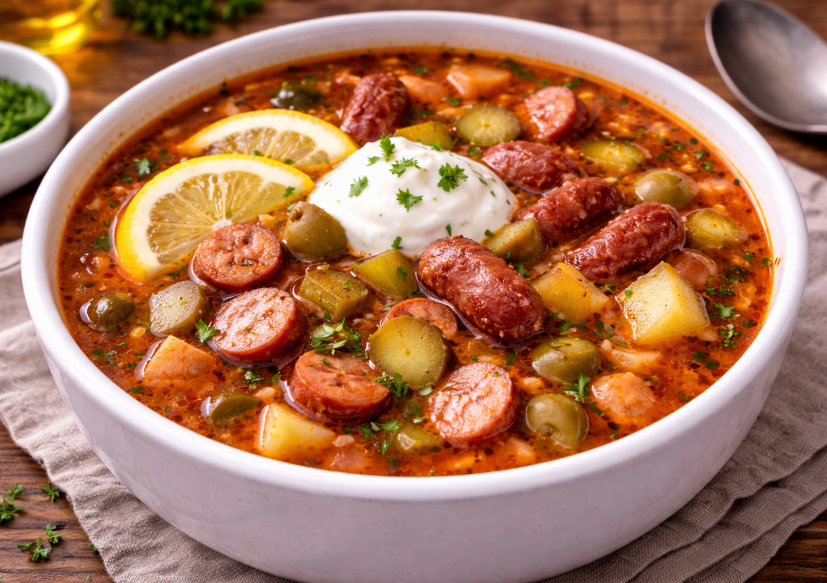 Фишка этого рецепта — в сочетании сосисок и охотничьих колбасок. Они дают тот самый копченый вкус, за который мы любим солянку.