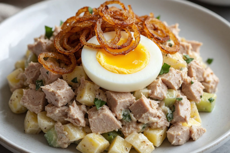 Спасатель для внезапных гостей: салат с тунцом, яйцом и хрустящим луком. Готовится за 10 минут, а съедается за 2. Это гениально простое и невероятно вкусное блюдо, идеальное для моментальной подачи, когда гости уже на пороге.