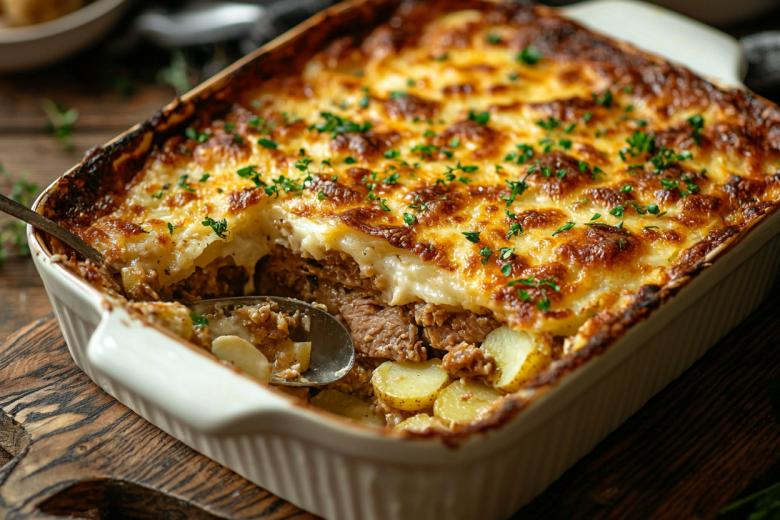 Для приготовления понадобится: 500 г свинины или говядины, 1 кг картофеля, 2 луковицы, 1 стакан кефира, соль, черный перец, паприка, сушеный чеснок, растительное масло для формы, 2 помидора и 100 г сыра (по желанию).