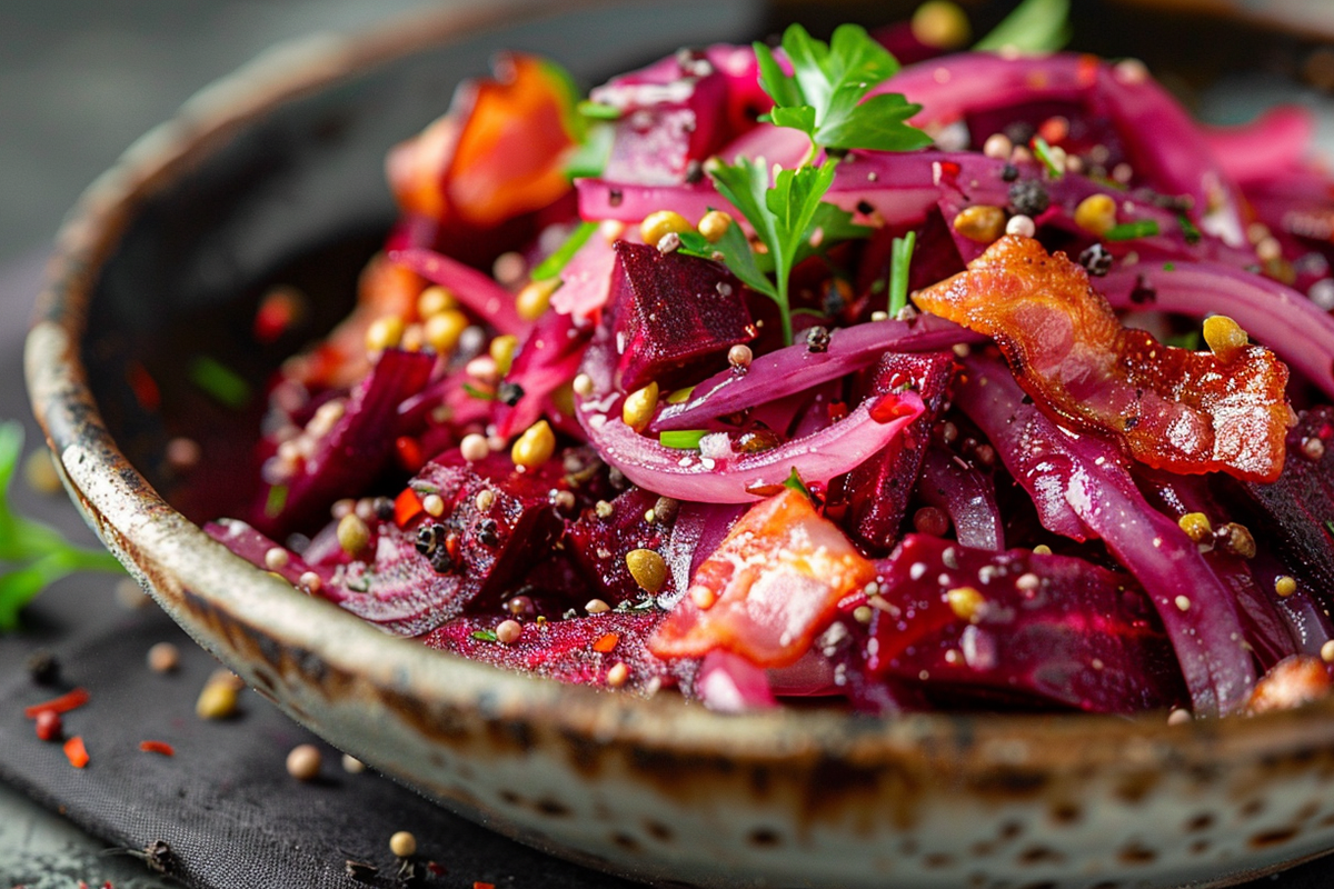Бекон и лук нарежьте небольшими кусочками, свеклу — тонкой соломкой. Обжарьте бекон до румяной корочки и переложите на салфетку. В той же сковороде смешайте уксусы, сахар и горчицу, прогрейте до растворения. Добавьте свеклу с луком и тушите около 15 минут, чтобы они стали мягкими и напитались соусом. В самом конце верните бекон, аккуратно перемешайте — и можно подавать. Получается ярко, сочно и очень вкусно!