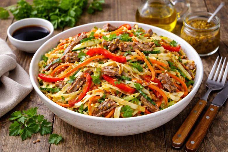 Говядину, перец и огурец нарезаем соломкой, капусту тонко шинкуем и соединяем с морковью по-корейски. Всё аккуратно перемешиваем. Для заправки смешиваем горчицу, соевый соус и растительное масло до однородности, затем заправляем салат и ещё раз gently перемешиваем. Подаём сразу — свежий вкус здесь решает.