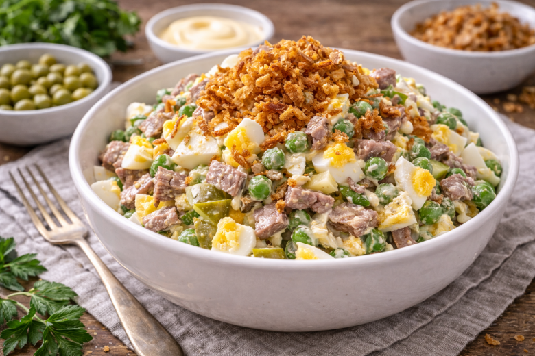Ингредиенты: отварной язык или говядина — 100 г, солёный огурец (корнишоны или бочковой) — 60 г, яйца варёные — 2 шт., зелёный консервированный горошек — 80 г, лук фри — 20 г, майонез — 30 г, соль и перец — по вкусу.