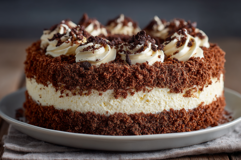 Собираю торт на тарелке или подносе, установив вокруг разъемное кольцо от формы. Укладываю первый светлый пласт, распределяю примерно треть крема, затем кладу шоколадный корж, снова крем и завершаю вторым светлым пластом. Верх торта покрываю кремом, оставив немного для боков. Накрываю торт пленкой и отправляю в холодильник минимум на 2 часа для пропитки. Перед подачей аккуратно снимаю кольцо формы, смазываю бока оставшимся кремом и обильно обсыпаю всю поверхность подготовленной крошкой.