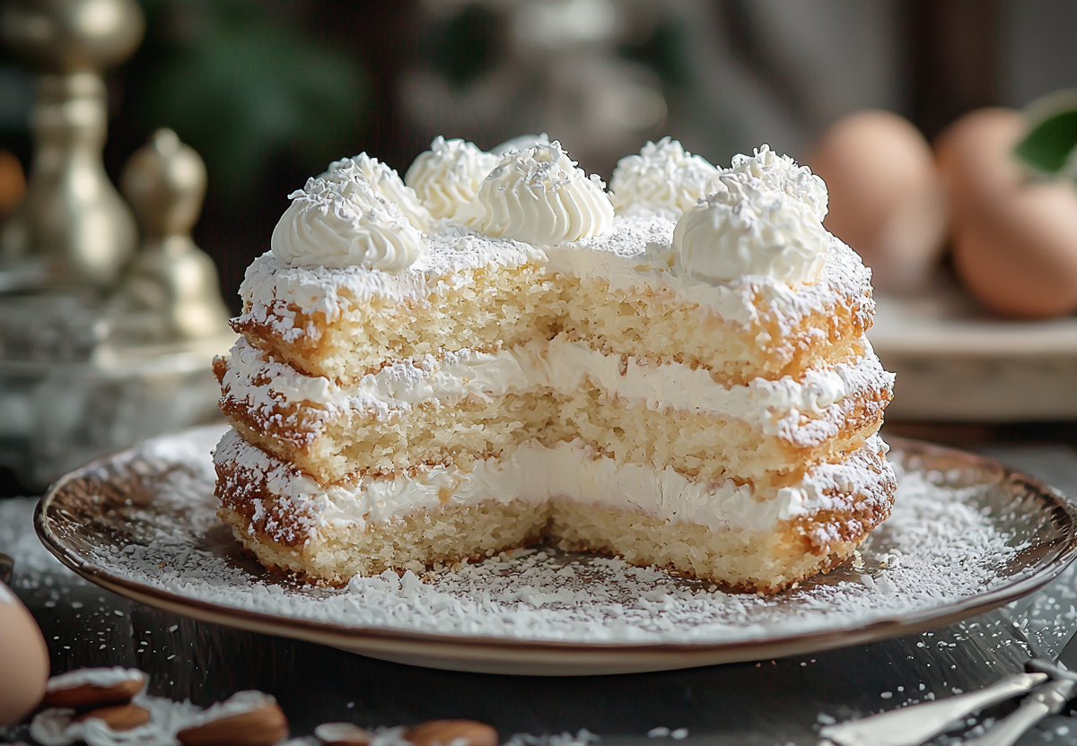 Рецепт: в миске смешайте яйца и сахар, взбейте до пены. Добавьте кефир, масло, соль, разрыхлитель и кокосовую стружку. Постепенно всыпьте муку, замесите жидкое тесто. Вылейте в форму (20–22 см), застеленную пергаментом. Выпекайте в разогретой до 180 °C духовке 35–40 минут. Бисквит остудите, разрежьте на 3 коржа.