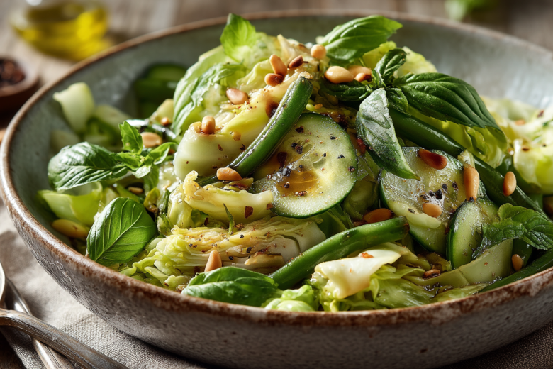 Это блюдо — доказательство того, что из доступных продуктов можно создать кулинарный шедевр. Замороженная стручковая фасоль, капуста и сезонные овощи превращаются в ресторанный теплый салат благодаря продуманной технике и двум волшебным акцентам.