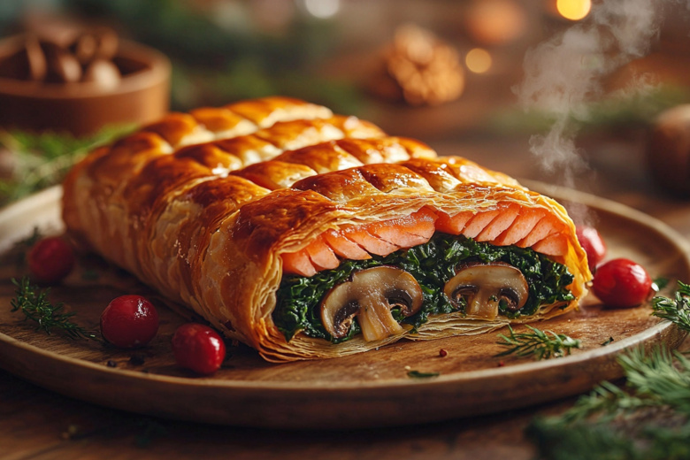 Обжарьте нарезанные шампиньоны с луком, добавьте чеснок и шпинат, затем вмешайте пармезан, сухари и крем‑сыр. Посолите, поперчите и снимите с плиты. Лосось посолите, поперчите, снимите кожу и удалите кости. Раскатайте тесто, выложите в центр начинку, сверху поместите рыбу. Заверните тесто, сформировав плотный сверток, переложите на противень. Взбейте яйцо с водой, смажьте тесто, сделайте надрезы и запекайте при 220 °C 20–25 минут до румяной корочки. Подавайте горячим — ваши гости будут в восторге!