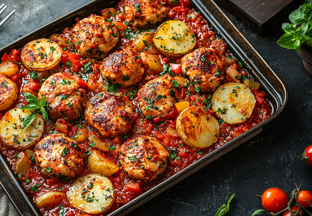 Вкус этого блюда — это удивительная гармония: сочные котлеты в насыщенном томатном соусе, нежная картошка и сладковатый перец, которые пропеклись в одном соку. Настоящая домашняя еда с минимальными хлопотами!